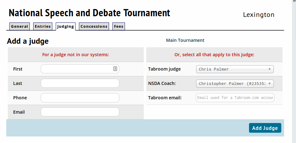 Below the entry for teams is where you register judges for Worlds Schools. Click Add Judges at top right. If the judge is in Tabroom already under their school record, or if they have an account for online balloting, choose them from the select menus at right. Otherwise, enter as much information as you can at left and save. Hit "Return to District Registration" at far right to return to your District WS Registration.