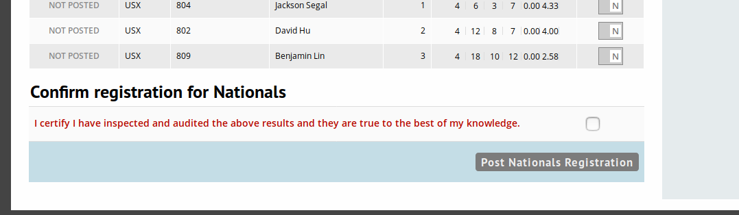 Once you have confirmed that all the above information is correct and complete, you can then post your final results to Nationals. Please do not do this casually, it's going to auto-notify your member coaches that everything is set and ready to go when you do it. When you are ready, go all the way to the bottom of the page, and click the check box to confirm you have checked it, and then post: