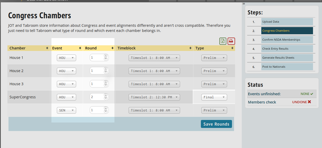 If you have uploaded Congress results, you have to do a small bit of tweaking to line up the correct chambers to the correct events. The way that Joy and Tabroom store Congress is very different and is hard to reconcile automatically. Therefore, just scan over the following screen and make sure all the chambers from Joy are arranged in their correct divisions (House vs Senate), rounds, and that if you ran Super Sessions/Finals, that they are marked as "Final" rounds at the far right. The correct time blocks don't much matter, as long as the rounds are properly numbered. If you change the round number or round type of one chamber of a round, all the chambers in that round will be changed.
