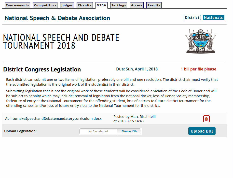 Once you click there, a screen will appear with the National Tournament name and logo. Underneath that will be a space to upload Congress legislation. You may upload up to two pieces of legislation, and delete and re-upload it at any time until the deadline: