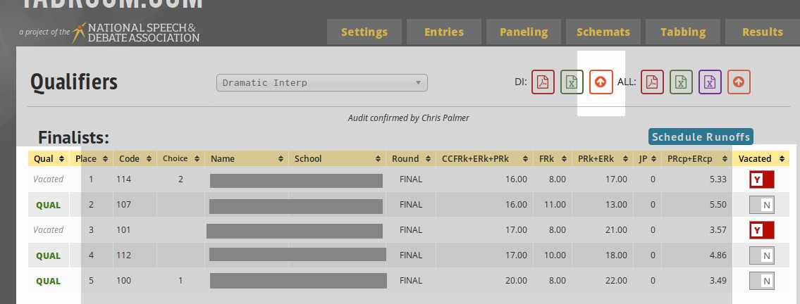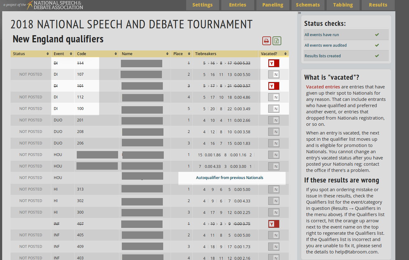 On this screen you can process your single-entry collisions. The "Choice" column should show what order of choice this entry is for the student. If a student is giving up a slot to Nationals, either because of single entry limitations or because the student is just not going to the tournament, slide the Vacate switch at far right. You should also Vacate entries by alternates who qualified in their preferred events. I'm hoping to automate this process eventually, but for now it has to be worked through manually. Once an entry is Vacated, the system should promote up the next slot. If you had to run a run-off to break a tie, you can schedule that runoff here and enter the results to break the tie.