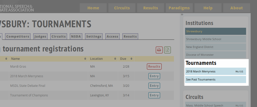 First log into Tabroom.com with the account tied to your District chair position. This should be the same email and password as the one you used in the Fall to register your District tournament series. Then, find your District tournament at right. If it has recently finished it will be visible under "Tournaments" on the right sidebar. Otherwise, click "See Past Tournaments" under Tournaments and find your district series on the list that appears.