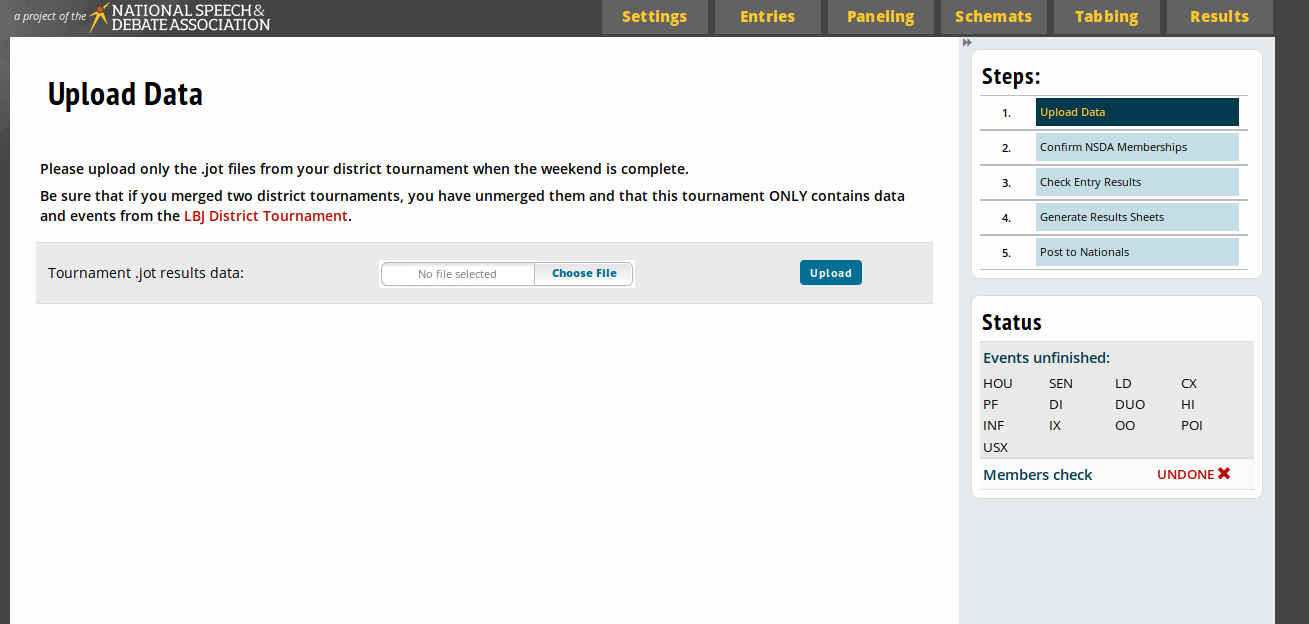 Click the first step, Upload Data, at right. You should be presented with an upload interface where you can upload your .jot tournament data file. Click on Choose File, select your .jot file, and then click Upload.