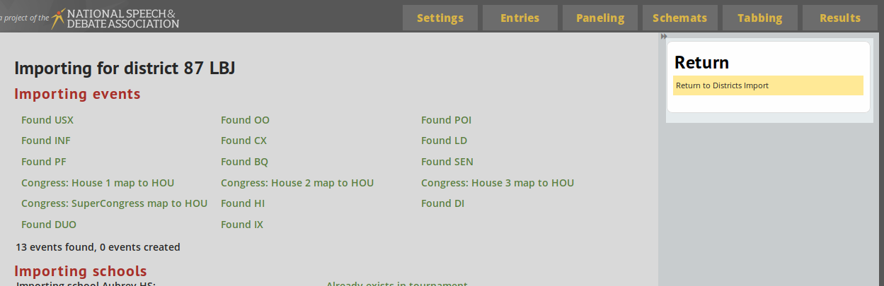 Once you run the uploader, you will see a large log of data being processed. It can't hurt to scan it for errors and the like, but for the most part the most common error will be that students' NSDA records cannot be found, and there will be a chance later to reconcile that easier. Once the process finishes you'll see a navigation menu to the right. Click Return to Districts Import to head to the next step.
