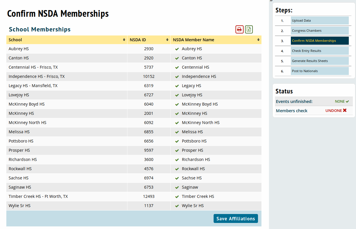 We have to make sure the NSDA records for a school and student are correctly linked for them to enter Nationals. In the vast majority of cases, the schools will link to their records properly and be reconciled. But in a few cases, either students who were not previously entered in Tabroom or students who were entered manually into the JOT system during the tournament might not be linked to their record. The next screen allows you to confirm that NSDA memberships are linked properly.