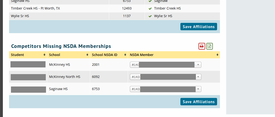 Below the school list, any students who do not have an active found NSDA membership will also be listed. Select the NSDA member student in the pulldown menu next to them to reconcile their membership. In most cases it will be a student who has their name listed somewhat differently (Mike vs Michael, etc). The system will try to find the closest matching student. If the student does not appear, then contact the National office.