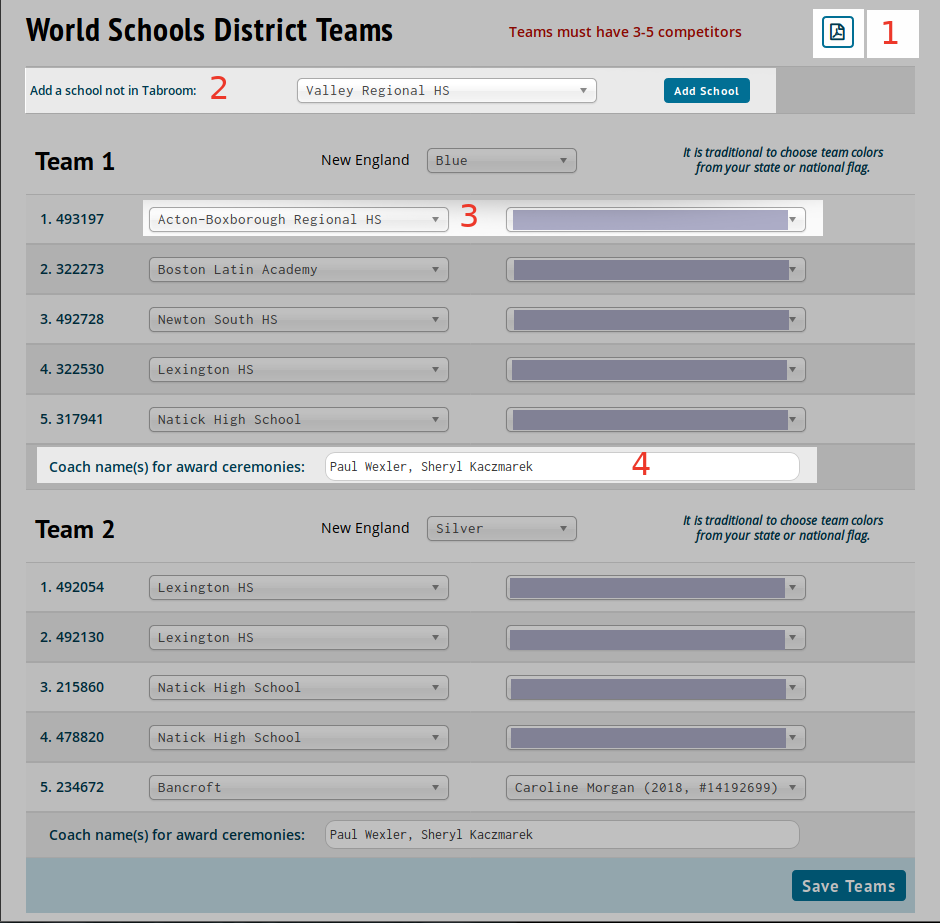 Then hit save below. The teams will be saved; team members will be visible to coaches as they register for Nationals as well.