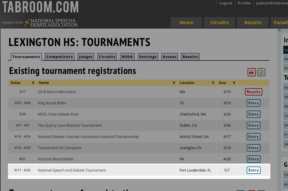 Once you get notified that your school's district's registration has been posted to Nationals, login to Tabroom.com. Make sure to log into the Tabroom account corresponding to the email address you got the notice from; some folks have multiple school records and Tabroom accounts and might not get their Nationals registration on the first one. (If you do have multiple schools records and accounts, and find this annoying, send an email to help@tabroom.com with the details and we can merge your divided identity together.) There is a "forgotten password" function beneath the Login box if you do not remember your Tabroom password.