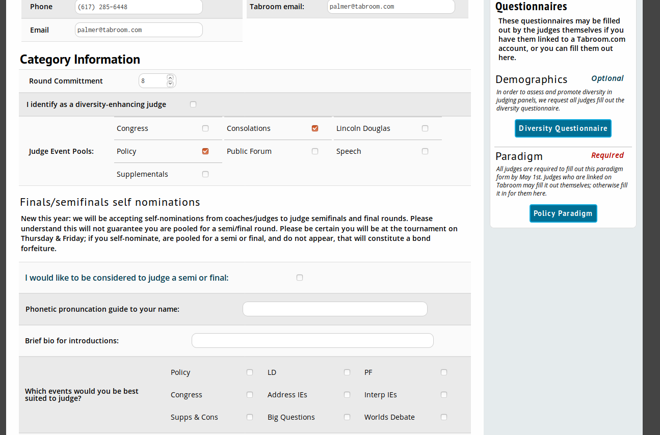 If you link the judge to a Tabroom.com account they will be able to fill out their own Paradigm Form and Diversity Questionnaire from their Tabroom account as well.