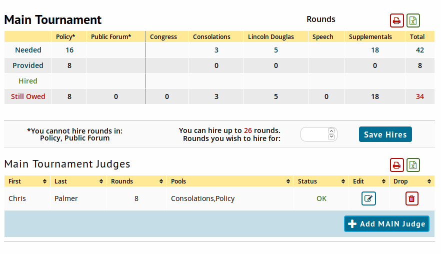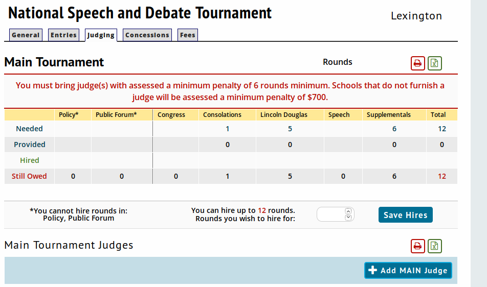 Once you save the judges you can click the Judges tab at the top, and/or the Return button at top right, to return to your Judging listing. Once you have done that, you can see how far along towards meeting your judging commitment you are. Use the "Request Hires" box to specify how many rounds you may wish to hire out for, with the caveat that Policy and PF rounds may not be hired ,and at least 6 rounds of judging must be supplied by the school.