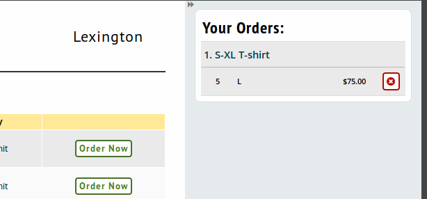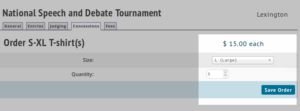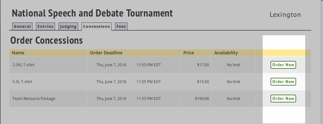 Use the Concessions tab to order T-Shirts or purchase a School Resource Package. You can select the item below, and then click the green Order Now button to specify sizes and quantities: