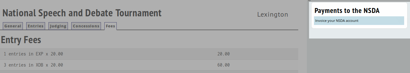 Finally you can go to the Fees tab once all is confirmed and your judging is set. You will see your fees listed out. Be sure you are being charged properly for the supps and cons, main events, and judging you have hired. if you are short on requested judging there will be very high penalty fees, for example. Your hotel discount will be applied here as well if you are staying in a block hotel.