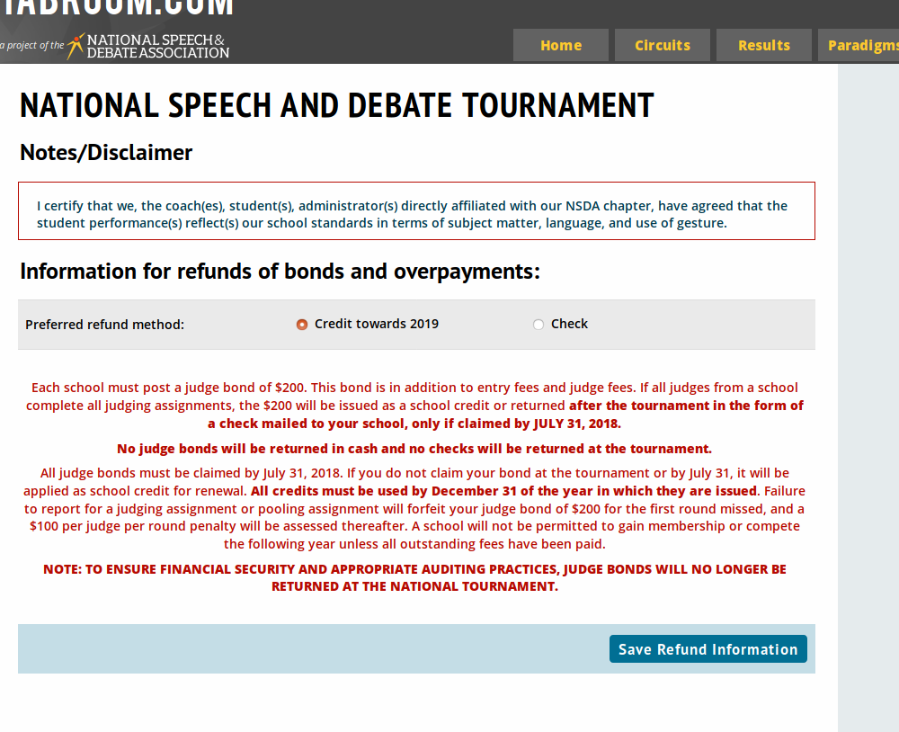 Then you will be asked how you would like your judge bond refunded to you. The options and policies around judge bonds have changed this year so please read the disclaimer carefully.