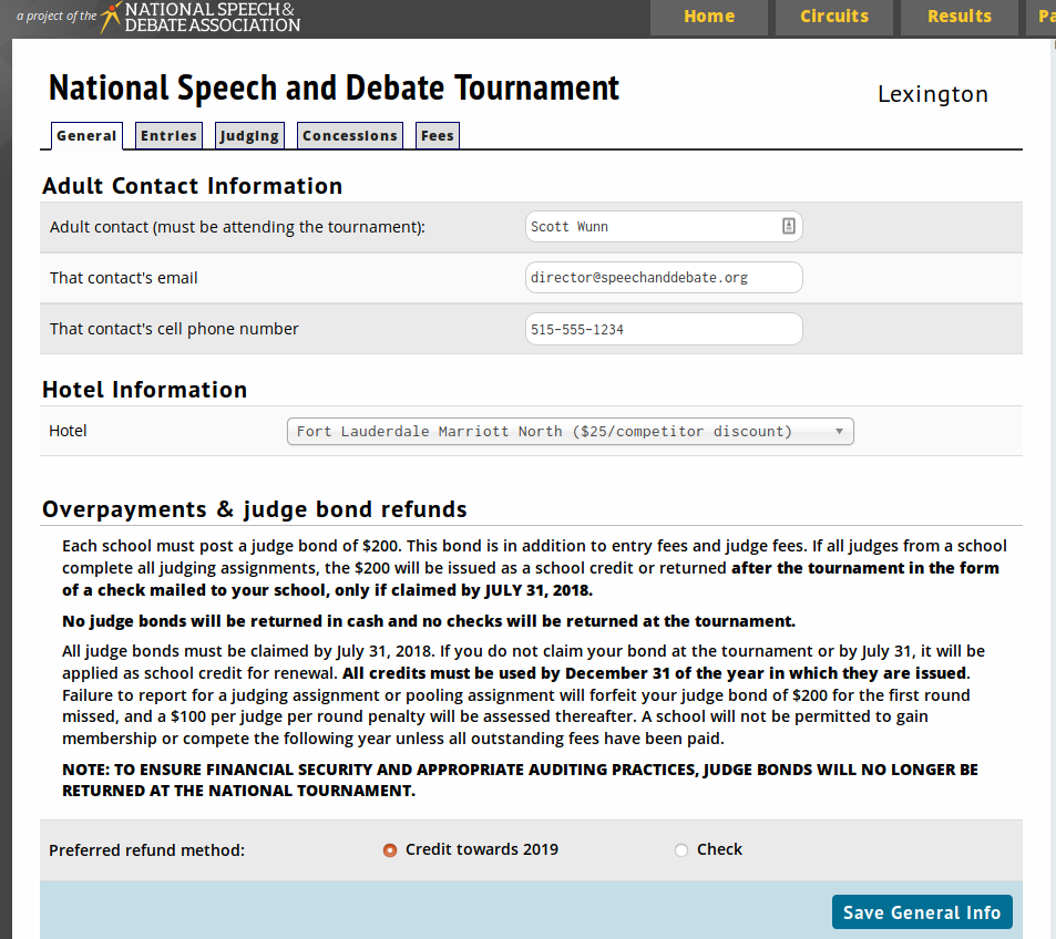 Once you select your refund amount you will be asked to provide the details of the adult/emergency contact who will be present at Nationals, and which hotel you are staying in. There is a new entry fee discount in 2018 Nationals so the hotel answer is important to calculating your final charges.