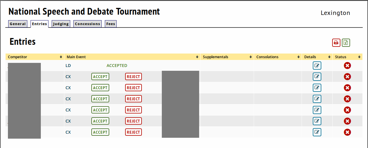 Click ACCEPT to accept an entry to Nationals, or REJECT to Reject that entry. When you reject an entry, a confirmation screen will require you to confirm the entry's rejection; the system will automatically inform and promote the alternate slot, so please do not do this unless you are certain.