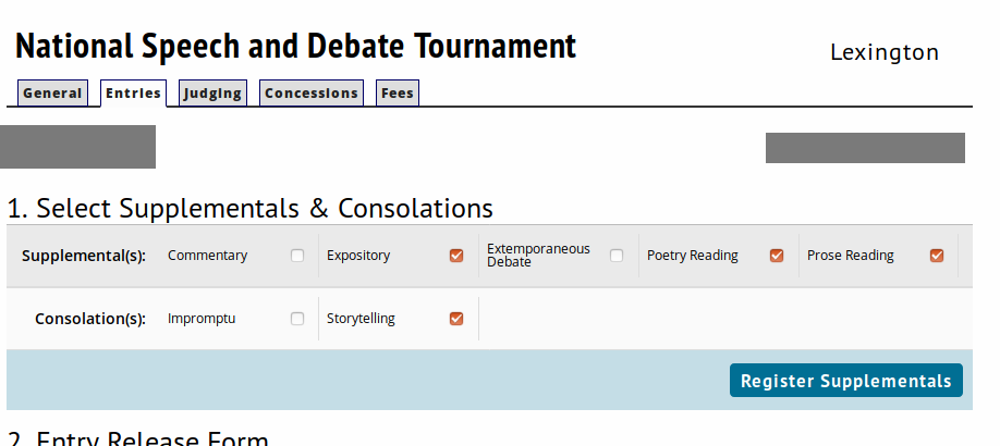 First, select the supplemental events you wish to pre-register the entry for, and click Register Supplementals. If you change your mind about which Supps and Cons you want the student in, you can change them here at any time before the May deadline: