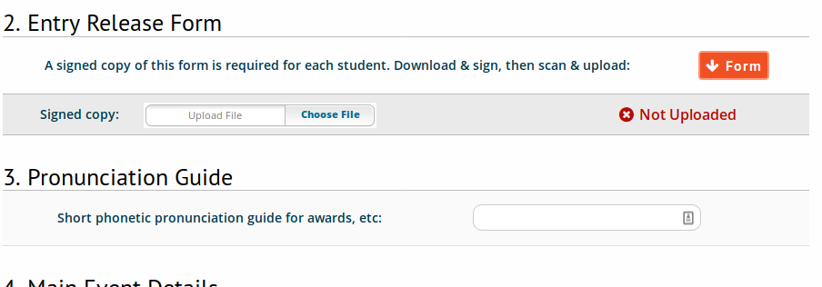 Then, in the next section, you can download, fill out and then re-upload a scanned copy of the student's mandatory video and release form. You can also provide a phonetic pronunciation guide if you wish: