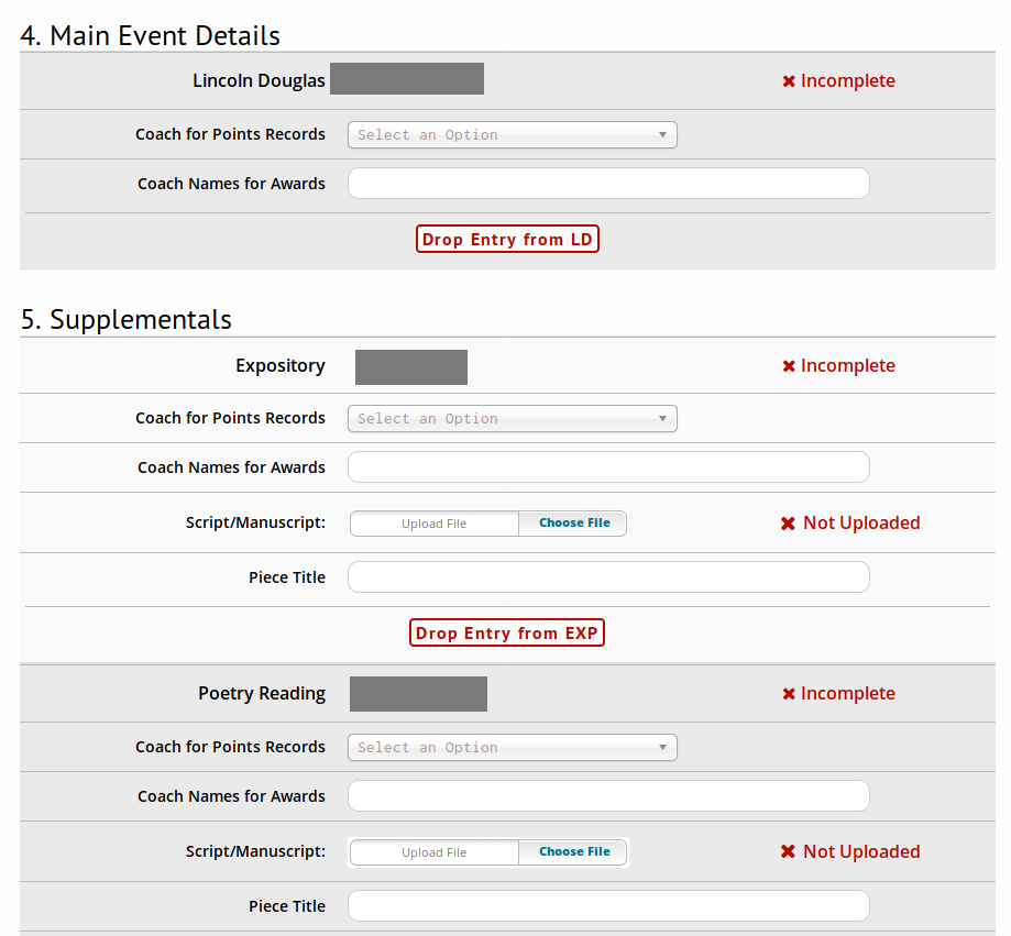 Next, for each entry (Mains and Supplementals) you will be asked to provide various information. For all events you will need to supply the coach of record to receive points credit, and the coach names you wish read at awards should the student qualify for recognition. In several events you will be asked for more information, such as piece titles, script uploads, and the like. You can also here drop entries that you have already accepted if it's prior to the May deadline.
