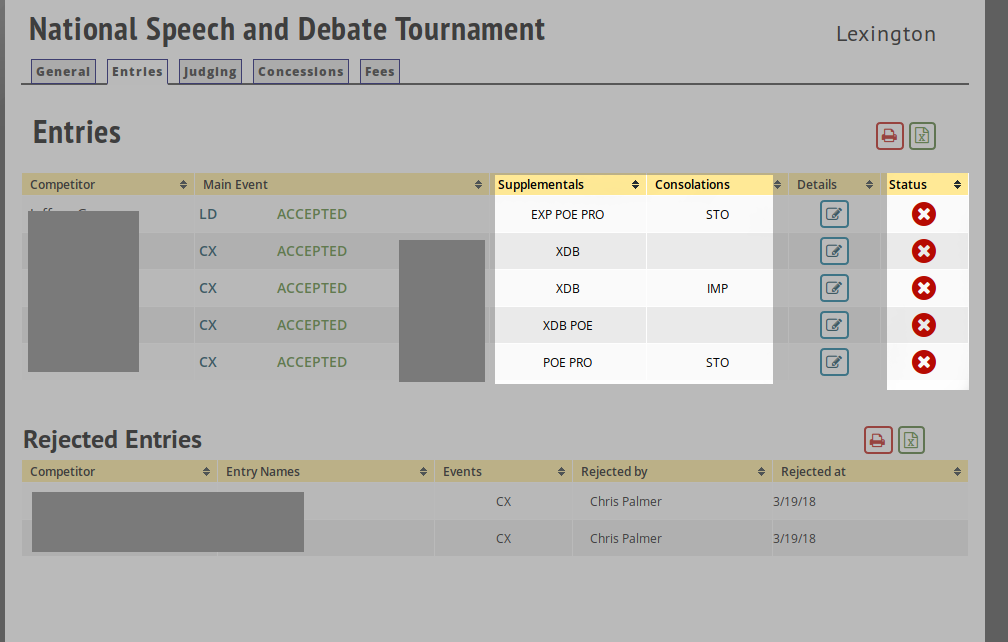 Once you have accepted an entry into their main event, then you can click the blue edit icon under the Details header at the right to fill in additional information about the entry, and register them for Supplementals and Consolations.