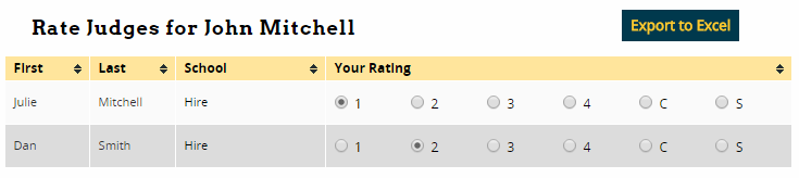 For example, if using tiers, you will select a tier for each judge. Note that "C" is a Constraint, and "S" is a Strike. You can also click the button to export your current pref sheet to a spreadsheet for future reference:
