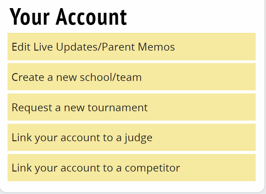 As a coach or director, you will use Tabroom to do things like manage your school's account, maintain your student roster, register for tournaments, and view school-wide results.