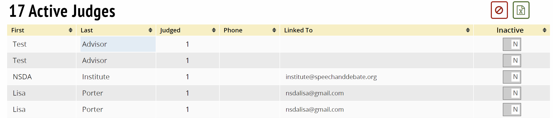 Clicking on a judge's first or last name will let you edit their information. You can also toggle a judge between active/inactive to keep your roster easier to manage. You can select whether to see active or inactive judges on the sidebar.