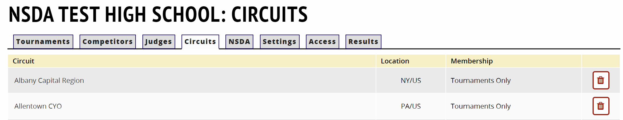 Once you have joined a circuit, your Circuits tab will change to show you the list of tournaments your school is a part of, and will give you the option to leave a circuit.
