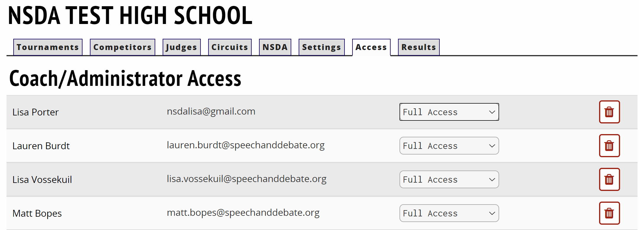 Each school can have multiple Tabroom accounts linked as an administrator for that school, for example if you have multiple coaches. Similarly, any Tabroom account can be given administrator access to multiple different schools, for example if you coach multiple programs but want to maintain separate student rosters.
