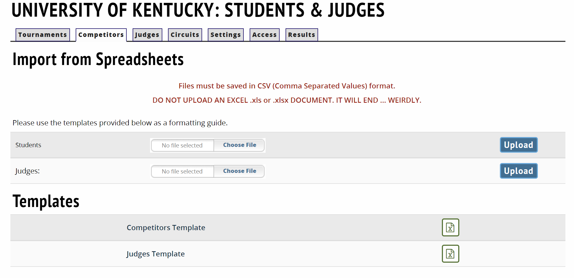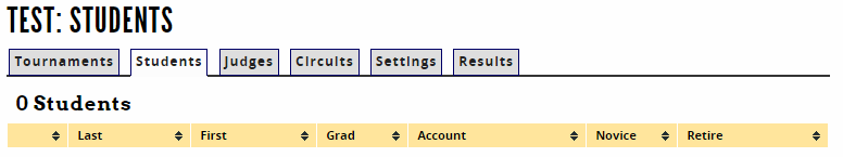 If you want to add a large number of judges at once, you can also use the "Import from Spreadsheet" option, which is found in the sidebar on your Students tab (not the Judge tab). For more information, see the section on Adding Students From A File above. Make sure you use the "Judge" template, instead of the "Student" template.