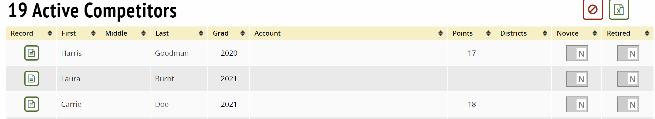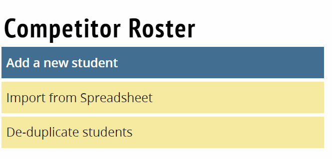 Before registering for a tournament, you must add students to your student roster. When you first go to the Competitors tab, your roster will be empty:
