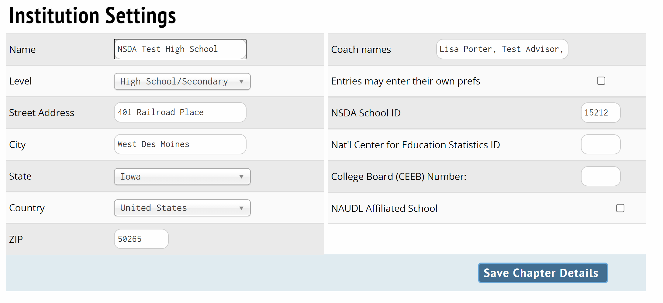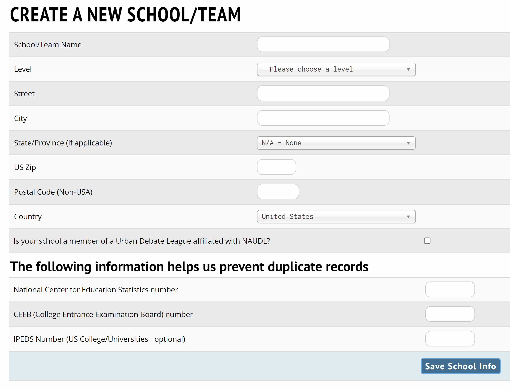 Then, fill out the required information such as School Name, State, etc. If you have a National Speech & Debate chapter number, or a variety of other school ID numbers, you can put them in here to ensure proper tracking. When done, press Save School Info.