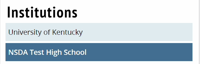 If your Tabroom account is listed as the administrator for more than one school simultaneously, you will see a list under "Institutions" in the sidebar on your account dashboard: