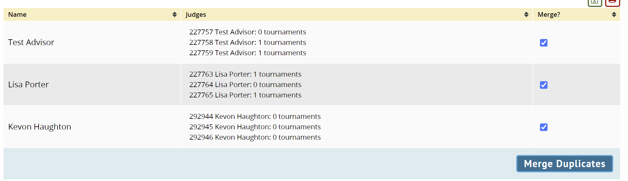 If you accidentally created duplicates on your judge roster, you can easily remove them by using the "Deduplicate judges" link on the sidebar. If any duplicates are found, you will be given the choice to merge them: