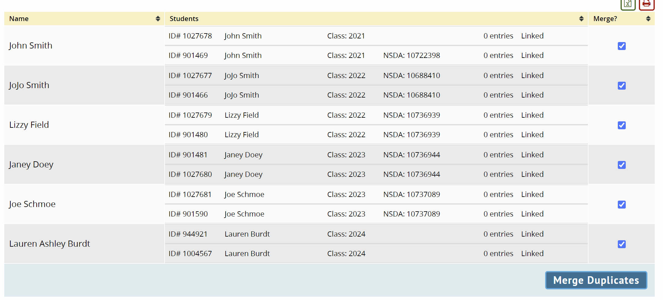 If you accidentally created duplicates on your student roster, you can easily remove them by using the "De-duplicate students" link on the sidebar. If any duplicates are found, you will be given the choice to merge them: