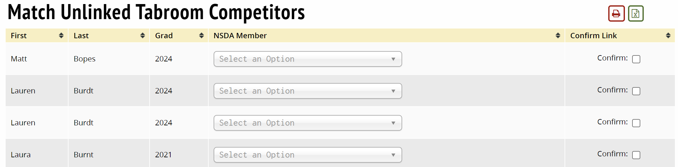 Tabroom will then show you the list of current students on your Tabroom roster (if any), and ask you to link each student with the correct entry from your roster with the National Speech & Debate Association. This is to ensure that each student is matched with the correct merit number. Using the dropdown menu for each student, choose a name, or "Do not link" if a student is not a member of the National Speech & Debate Association. You must also check the "Confirm" box next to each student.