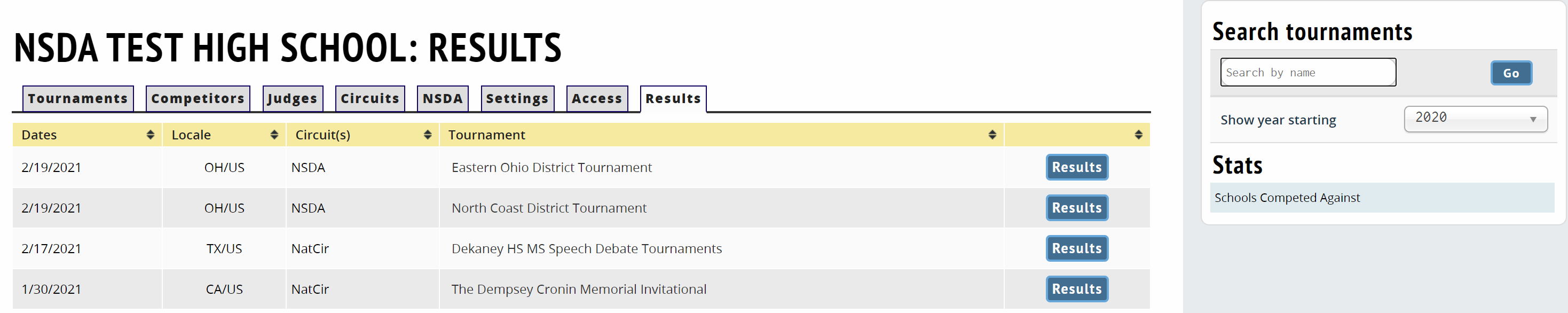 On the main Results tab, you can also see a list of all the schools your program has competed against (e.g. for PR reasons):