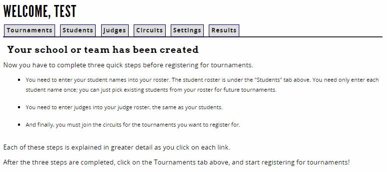 Once you have linked to or created a school, added students and judges to your roster, and joined a circuit, you can see the section of the manual on Registration.