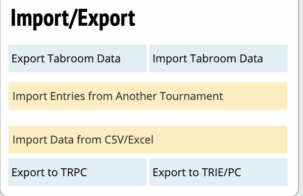 Tabroom can import entry data (including schools and judges) from a variety of sources, including the "Universal XML" format used by the TRPC, CAT, and STA, as well as importing registration data from Joy of Tournaments.