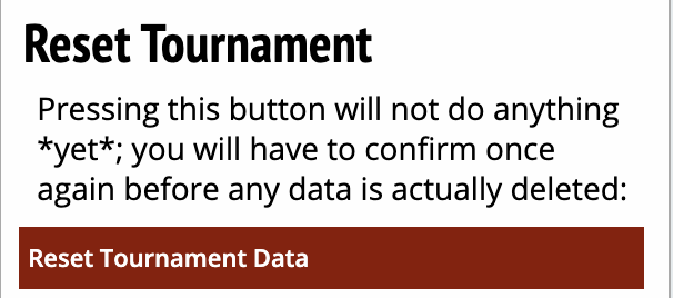 If necessary, you can also completely reset your tournament data using the link on the sidebar. For obvious reasons, this shouldn't be done once a tournament has started - once you've deleted everything, there's no way to get the data back.