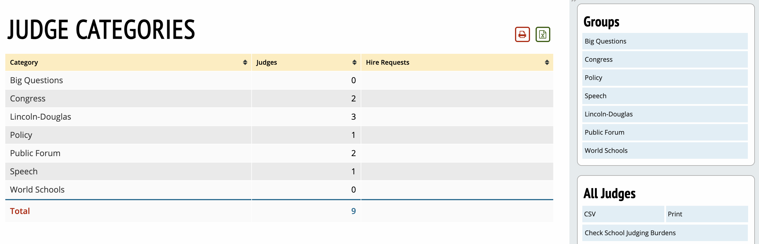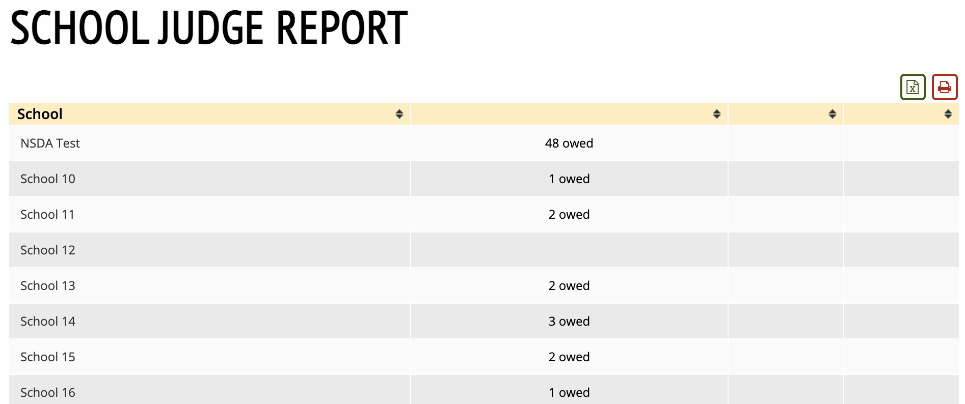 Displays how much judging a school owes in a given event. The columns are sortable.