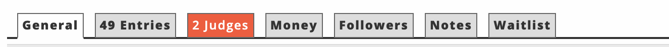 Judges - This tab shows a list of judges from a school, and the events they are registered in, for a particular tournament. This tab will be red until you have entered or hired enough judges to cover your school's entries.