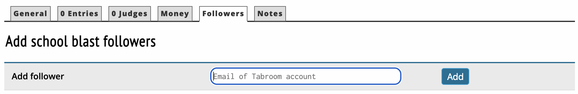 Followers - This tab allows you to add followers to your school's tournament notifications.