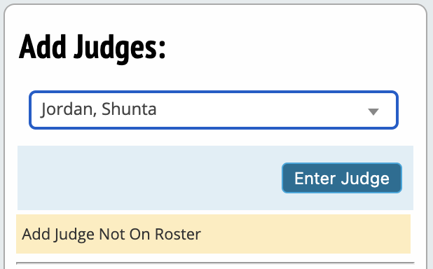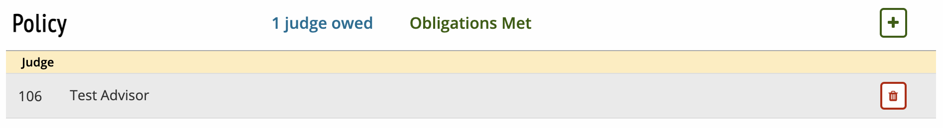 Add Judge or Plus sign - Adds a judge to that event for a given school. Can be previously on the school's roster or not.