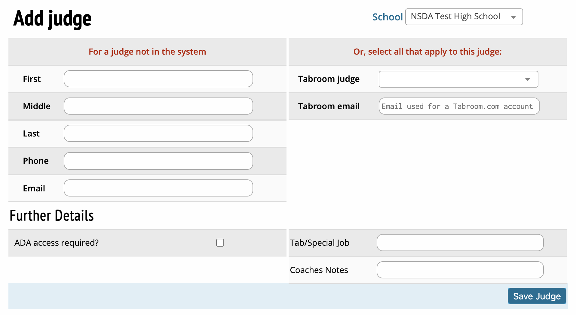 Information inputs to enter a judge not previously entered on a school's Tabroom roster.