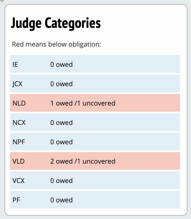 Judge Categories - Toggle between events to see what judges a school has entered in those events.