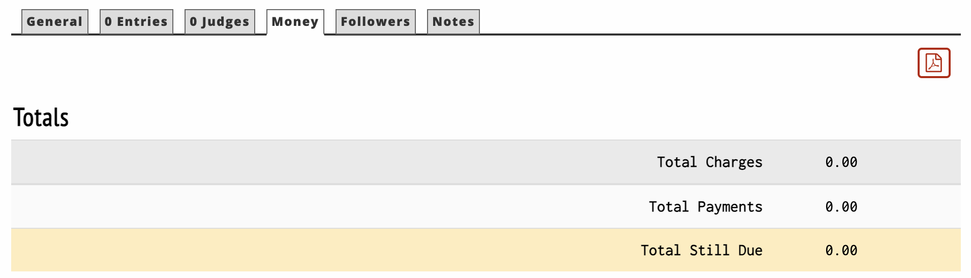 Money - This tab shows how much money a school owes once registered for a tournament. This tab will be red until you have paid all entry and judge fees in full.