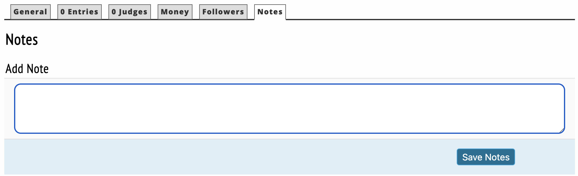 Notes - This tab allows you add any notes relevant to your school related to students, judges or the tournament.