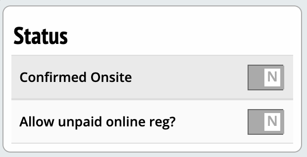 Confirmed Onsite - Toggle to mark a school as onsite/confirmed registered for a tournament.