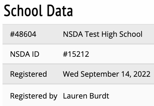 Information on a school's entry related to what NSDA chapter they are in, who registered them, when the school was registered them and who signed any relevant disclaimers related to the tournament.