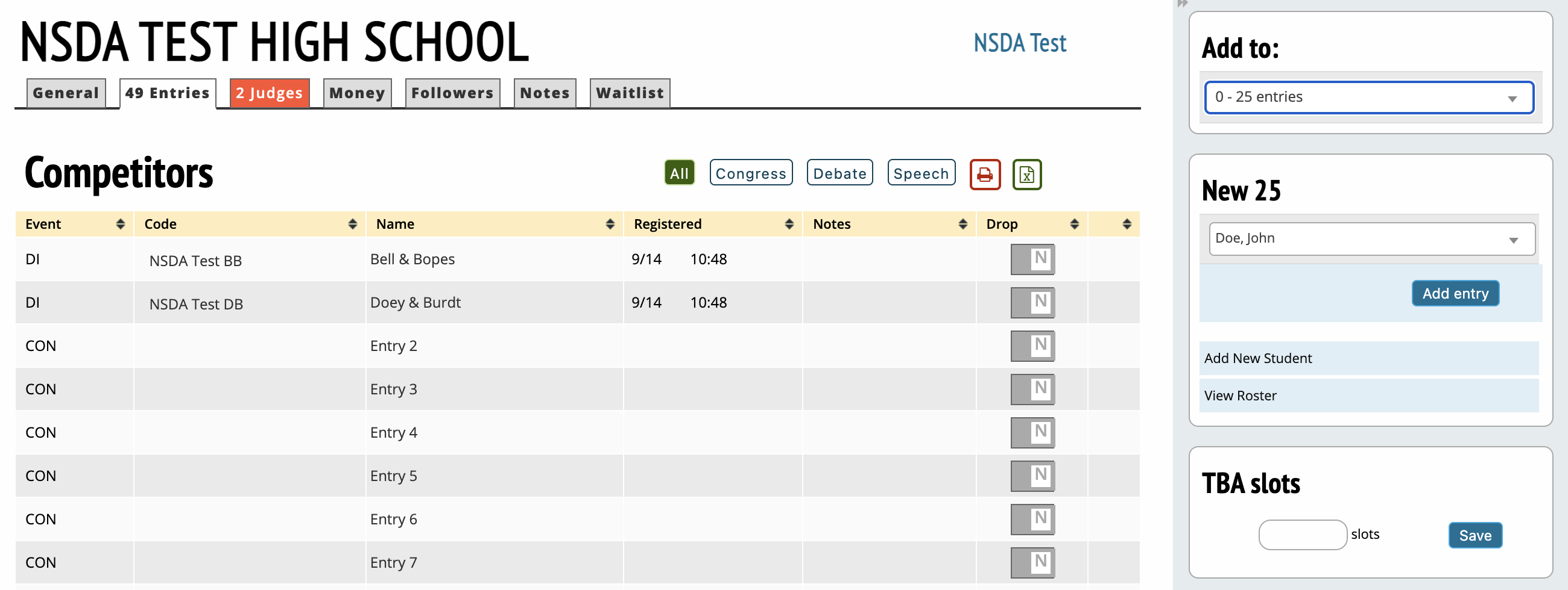 TBA Slots - Entering a number and clicking save will result in that many entries in a given event being added to the tournament, but with no student names.